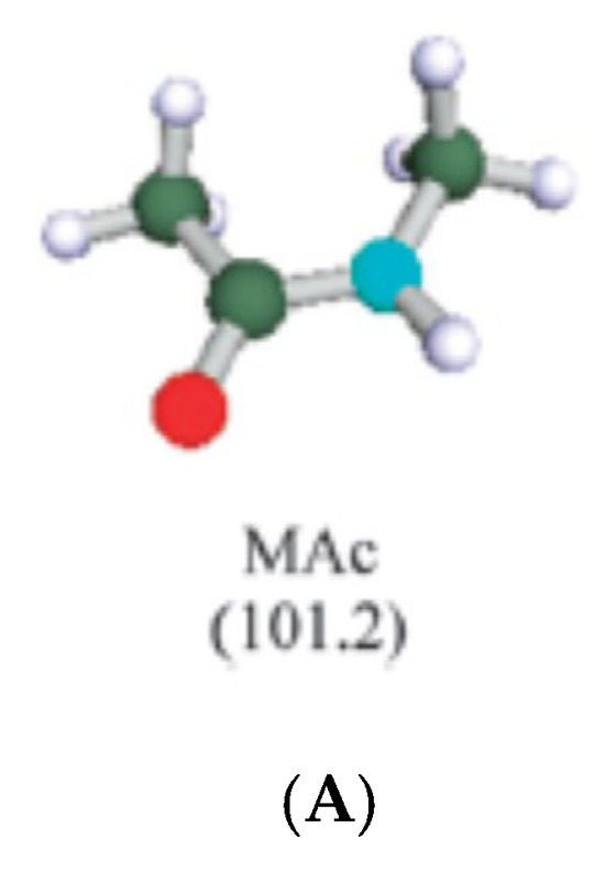 (A) Structure of N-methylacetamide (Mac) () with its volume in . C (green), H (white), N (blue), and O (red). (B) Arrhenius (a) and VFT (b) plots on the temperature dependence of ionic conductivity of liquid electrolytes (Mac with Li salts). The lithium-salt mole fraction was 0.2. The solid lines represent the VFT fitting. Reprinted with permission from Ref. [68]. Copyright 2013, Royal Society of Chemistry.