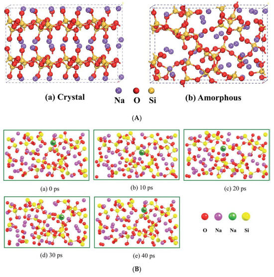 Here, an ab initio molecular dynamics simulation by Lei et al. [104] is briefly reviewed to identify the reason for the much higher ionic conductivity in amorphous solid electrolyte compared to crystalline , although there could be some differences between inorganic solid and polymer electrolytes. The material is important because , which has relatively high ionic conductivity of at 500 °C, consists of an amorphous phase and a phase [104,105,106]. The ionic conduction is only in the amorphous phase because the phase is an electric insulator. Lei et al. [104] performed molecular dynamics simulations to study the mechanism of high ionic conductivity in the amorphous phase (Figure 14). The structures of crystalline and amorphous used in the molecular dynamics simulations are shown in Figure 14A [104]. The simulated transport of ion in amorphous Na2Si2O5 is shown in Figure 14B, where the ion in motion is shown with a green ball. According to the simulation, the motions of and are negligible compared to that of the ion. As seen in Figure 14B, the motion of the ion is relatively fast, which supports the high ionic conductivity in the amorphous Na2Si2O5 phase. On the other hand, the lowest energy barrier for the ion conduction in the crystalline phase is estimated to be as high as 1.18 eV, which is shown in Figure 14C [104]. At such a high energy barrier, the crystalline phase would be an electrical insulator [104]. The reason for the high ionic conductivity in the amorphous phase is the much weaker Na-O Coulombic attraction due to the long-range disorder in the amorphous phase comparted to that in the crystalline phase [104].