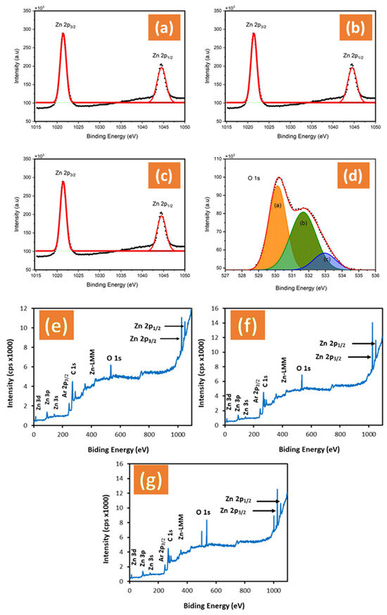 Surface X-ray photoelectron spectroscopy (XPS) spectra of the Zn 2p1/2 and 2p3/2 core level scans in (a) un-treated ZnO film, (b) ZnO + NH4F, (c) ZnO + EDA films, (d) O 1s of untreated ZnO, the orange color (a) corresponds to O2− ions within the ZnO lattice, the green color (b) attributed to O− and O2− ions in oxygen-deficient regions and the blue color (c) is assigned to OH groups on the ZnO surface or adsorbed/dissociated oxygen species, and (e–g) XPS survey spectrum of untreated ZnO, ZnO + NH4F, and ZnO + EDA films.