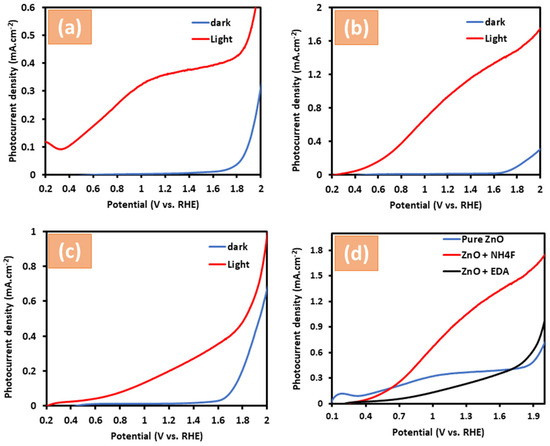 This study explored the influence of NH4F and EDA capping agents on the photocatalytic activity of zinc oxide to highlight their potential for improving the use of sunlight as a renewable energy source. As shown in Figure 5, PEC water measurements were conducted in 1.0 M KOH (pH 13.5) to generate linear sweep voltammetry (LSV) curves for untreated ZnO, ZnO capped with NH4F and ZnO capped with EDA in darkness and simulated sunlight (AM 1.5 G, 100 mW/cm2). Figure 5a shows that under dark conditions, the photocurrent of the untreated ZnO nanostructure sharply increases at a voltage of approximately 1.60 VRHE. However, under simulated sunlight conditions, the same sample exhibited a photocurrent peak of about 0.35 mA cm−2 at 1.23 VRHE, where RHE corresponds to the potential of the reversible hydrogen electrode. Figure 5b shows the photocurrent graphs of ZnO + NH4F under sunlight conditions. Treatment with NH4F caused an increase in photocurrent, which reached 1.0 mA cm−2 at 1.23 VRHE (Figure 5b). By contrast, ZnO treated with EDA reached a photocurrent of around 0.21 mA cm−2 at 1.23 VRHE (Figure 5c), indicating a lower photocurrent for ZnO + EDA than for untreated ZnO. The lower PEC performance for ZnO + EDA could be attributed to its limited stability, as ZnO + EDA exhibited a higher rate of degradation compared to ZnO or ZnO + NH4F.