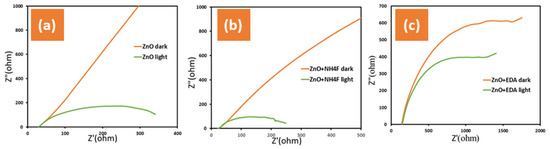 The EIS measurements were employed here to analyze the interfacial properties between the photoanode and electrolyte of the fabricated samples. The Nyquist plots, representing the imaginary and real components of the EIS plots (Z’ versus -Z’’), were measured at 1.0 VRHE under dark and simulated sunlight conditions (AM 1.5 G, 100 mW/cm2) (Figure 6). The EIS, employed to determine the solution resistance and charge transfer resistance, revealed that the untreated ZnO + NH4F films had the lowest Rct values in the dark and simulated sunlight (Figure 6a), whereas the untreated ZnO + EDA films exhibited the highest Rct values under both conditions (Figure 6c). Higher Rct for ZnO + EDA compared to pure ZnO or ZnO + NH4F indicates that the addition of EDA does not enhance and may even hinder charge transfer. This contrasts with ZnO + NH4F, where the addition of NH4F during preparation improved the morphology and lowered the Rct. value. The increase in Rct for ZnO + EDA could be linked to the creation of an unfavorable morphology or the blocking of active sites, which would lead to poorer electrochemical performance and stability. Furthermore, ZnO + EDA exhibited poor stability, suggesting that degradation may have occurred during the measurements.