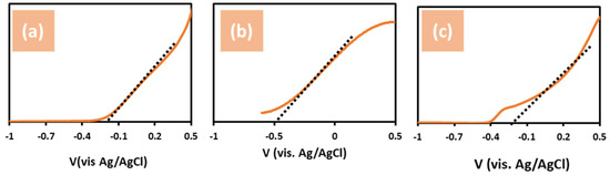 where A is the active area; e is the electron charge; εο is the permittivity of a vacuum; ε is the dielectric constant; T is the absolute temperature; kB is the Boltzmann constant, and E is the applied potential. The Mott–Schottky plots shown in Figure 7 exhibited the n-type conductivity of all samples. Figure 6a shows that the untreated ZnO nanostructure reveals a flat band gap potential at -2.1 VAg/AgCl, whereas the flat band gaps of the ZnO treated with NH4F and EDA are calculated as −5.0 and −2.5 VAg/AgCl, respectively (Figure 7b,c). By comparison, ZnO + NH4F displayed the highest negative flat band potential (Vfb) value. However, since the flat band potential (Vfb) of ZnO is typically around −0.5 V vs. Ag/AgCl, our results for ZnO are generally consistent with those reported in the literature [44,45,46].