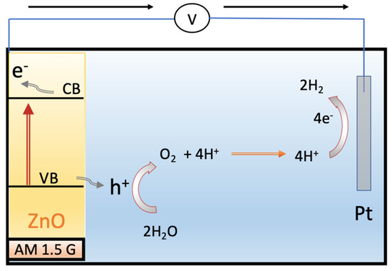 Figure 10 illustrates the proposed mechanism for photoelectrochemical (PEC) water splitting using a ZnO photoanode under visible light illumination. The valence band (VB) position of ZnO is estimated as 2.92 eV, while the conduction band (CB) position is around −0.33 eV, according to a previous report [49]. The VB position of ZnO is more positive than the oxidation potential (1.23 eV vs. RHE), indicating that holes generated through photoexcitation in the valence band have sufficient potential to oxidize water. Concurrently, electrons are transferred from the conduction band of ZnO to the cathode, leading to water reduction. The morphological changes in ZnO enhance charge transport, thereby reducing the electron–hole recombination rate and improving the efficiency of electron–hole separation.
