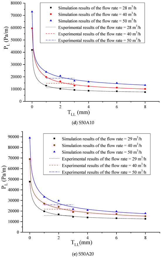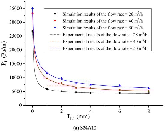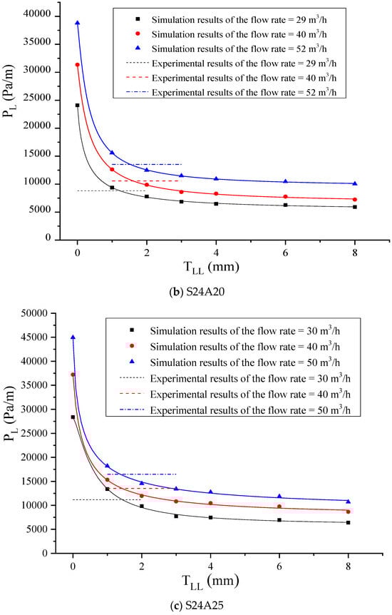 The fitting line between the simulated PL and the measured PL when the TLL was 2 mm is shown in Figure 14. It could be found that the error between the fitting line and the line of y = x was smaller. This indicated the simulation results were well correlated with the experimental results. In reference [24], a TLL of about 2 mm was obtained by means of the particle image velocimetry technique, which is consistent with our conclusions. The effect of concrete types on the TLL is shown in Figure 15. Regardless of the size of the aggregate and the flow rate pumped, 1 mm < TLL < 2 mm for S24 concrete and 2 mm < TLL < 3 mm for S50 concrete. However, the value of the TLL was related to the strength (S24, S50), the size of the aggregate (A10, A20, A25), and the flow rate of pumping. The relationship between the PL and the TLL is shown in Figure 16; this relationship is similar to the effect of concrete types on the TLL. It was found that when the PL was larger than 14,000 Pa/m, 2 mm < TLL < 3 mm; conversely, 1 mm < TLL < 2 mm. Relating Figure 15 to Figure 16, it was concluded that both the type of fresh concrete and the flow rate of pumping significantly affected the PL. Then, the PL impacted the TLL. However, the TLL also impacted the PL. Finally, this made the TLL change within a certain range. The above findings also guide us in using CFD to simulate the flow of all types of concrete in the actual pumping pipeline with a TLL of 2 mm to obtain their pumping pressure and guide the actual construction.