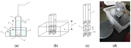- Sample installation. The processed specimen was inserted into the square cylinder (part 3 in Figure 1) and then the base was assembled (part 10 in Figure 1) at the bottom of the square cylinder, as shown in Figure 1c. Then, the square cylinder was placed into the water tank (part 4 in Figure 1) and the upper edge of the specimen was sealed again with rubber putty.