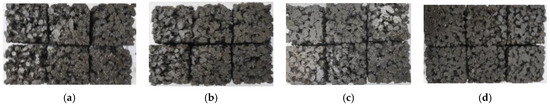 It could be seen that the pores on the bottom surface of PRAC made with aggregate particle sizes of 4.75~9.5 mm were the most numerous and homogeneous but the pores on the bottom surface of PRAC made with aggregate particle sizes of 16~9 mm were significantly reduced, which indicated that the number of pores on the bottom surface of the PRAC specimens decreased with an increase in the aggregate particle size. This phenomenon occurred because the smaller the particle size of the coarse aggregate within the same cross-section of PRAC, the greater the amount of coarse aggregate it contained, resulting in a greater number of pores between the aggregates. Additionally, there was a significant difference in the pore morphology at the bottom of the PRAC when the aggregate particle sizes were 9.5~16 mm or 16~19 mm, respectively, due to the fact that the differences in the aggregate particle sizes in both cases were 6.5 mm and 3 mm, respectively, and the larger difference in the particle sizes allowed for more smaller particles to fill the pore spaces between the larger particles.
