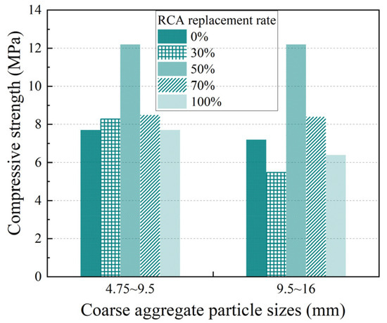 Pervious concrete with coarse aggregate particle sizes of 4.75~9.5 mm exhibits a higher compressive strength and lower permeability coefficient than that with coarse aggregate particle sizes of 9.5~16 mm. Furthermore, pervious concrete featuring coarse aggregate particle sizes of 16~19 mm demonstrates superior compressive strength and a reduced permeability coefficient when contrasted with the former two cases, indicating that the influence of aggregate particle size on the performance of PRAC cannot be ignored [20,21]. For example, when the RCA substitution rates were 0%, 30%, and 100%, respectively, the compressive strength of pervious concrete with particle sizes of 9.5~16 mm decreased by 6.5%, 32.5%, and 16.9% compared with those with particle sizes of 4.75~9.5 mm. Concurrently, the increases in the permeability coefficient were 5.8%, 30.5%, and 22.1%, respectively. In the case of the 100% RCA substitution rate, the compressive strength of the PRAC with coarse aggregate particle sizes of 16~19 mm increased by 245.5% and 315.6% and the permeability coefficient decreased by 81.7% and 85% compared with those with particle sizes of 4.75~9.5 mm and 9.5~16 mm, respectively.