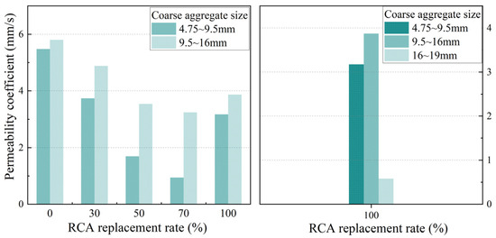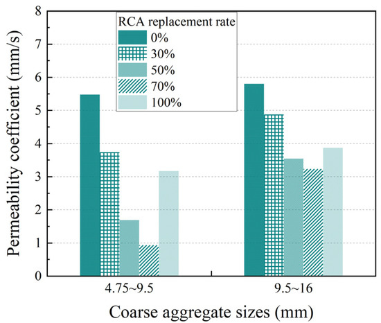 Figure 5 and Figure 6 show the influence of the RCA replacement rate on the compressive strength and permeability coefficient, respectively, for the two types of PerC containing coarse aggregates with particle sizes of 4.75 mm~9.5 mm or 9.5 mm~16 mm.