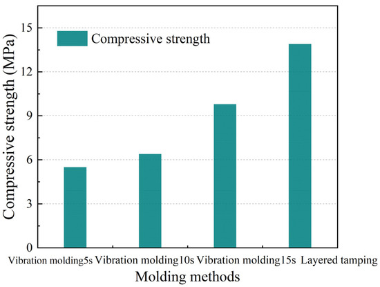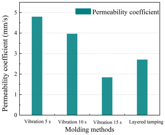 In addition, the compressive strength of the PRAC prepared using the layered insertion-tamping method was higher than that of the vibration molding method. For example, the compressive strength of PRAC produced by layered insertion-tamping was 41.2% higher than that produced by vibration molding with a maximum vibration time of 15 s and the permeability coefficients were reduced by 44.5% and 31.7%, respectively, compared with PRAC produced by vibration molding for 5 s and 10 s, but increased by 7.3% compared with PRAC produced by vibration molding for 15 s. It should be noted that extending the vibration time (such as 15 s of vibration) may increase the strength of PRAC but it can also cause the permeability of PRAC to be even lower than that of PRAC prepared using the layered insertion-tamping method.