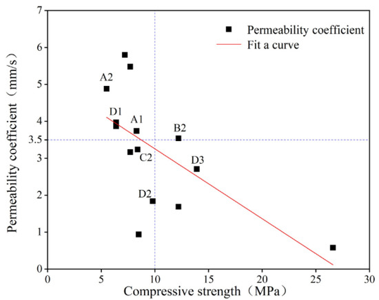 Relationship between compressive strength and permeability coefficient of PRAC.