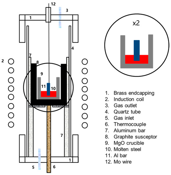A total of 500 g of steel was placed in a MgO crucible (ID: 62 mm; OD: 71 mm; H: 80 mm), and some Fe2O3 powder was also put into the crucible in order to adjust the dissolved [O] in steel. The MgO crucible was placed in a protective graphite crucible before heating it in a tube furnace, which was equipped with a B-type thermocouple and controlled with a PID (proportional–integral–derivative) controller. The furnace was heated at a rate of 10 °C/min until 1400 °C and at 5 °C/min thereafter. Schematic of experimental apparatus was shown in Figure 1. We started injecting high-purity argon (Ar ≥ 99.99 mass%) into the furnace when the temperature was 600 °C at the gas flow rate of 1.5 L/min, adjusting the latter to 2.5 L/min when the furnace temperature was above 1500 °C.