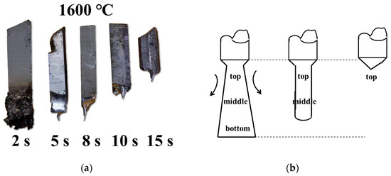 The typical morphology of the Al bars after the reaction was the conical shape caused by the natural convection of molten liquid steel, as shown in Figure 2, where the radial diameter at the top was larger than that at the bottom. The density of liquid steel increases at low temperature. Thus, given the difference in liquid steel density along the vertical solid–liquid surface because of the heat transfer between the two materials, the molten medium started to flow in the direction of the arrow shown in Figure 2b; high-density liquid steel was constantly replaced by low-density molten steel, ultimately inducing natural convection [8].