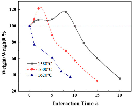 The whole Al alloy melting process can be described in three steps: the formation of a solidified layer, the latter’s rapid melting, and Al alloy normal melting. In the first step, hot steel cools on the surface of the Al bar, and a solidified layer forms quickly, with its thickness being dependent on the heat transfer. In the second step, the thickness of the formed steel layer decreases until the latter disappears completely, and the surface of the Al bar is again exposed to molten steel. In the end, the Al bar starts melting at a stable dissolution speed which is dependent on the heat balance between the two materials. Figure 3 shows the weight change curves of the aluminum bars at 1580 °C, 1600 °C, and 1620 °C, and the green line in the figure was the 100% standard line.