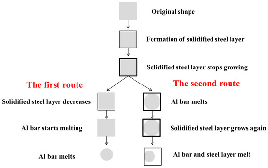 The two possible routes of the melting process of an Al rod in liquid steel are shown in Figure 4.