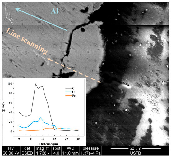 Figure 5 shows the line-scanning result of an Al bar’s cross-section at 1600 °C for 5 s, where a carbon-containing layer whose thickness was about 10 μm was discovered. The carbon diffused from the molten steel pool to the Al bar surface because of the carbon concentration gradient, even though only 0.129% [C] was contained in the molten steel in this study. Specifically, the carbon concentration gradient induces the diffusion of this element from molten steel to the Al bar to decrease the melting point of the latter. This phenomenon is in line with research results on scrap steel melting in hot metal with a larger carbon concentration gradient [18,19,20].