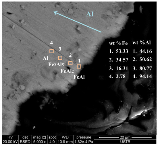 The SEM-EDS dot scan mode was used in order to distinguish the different diffusion layers, and every dot was tested three times to obtain the average composition. In the SEM-EDS image in Figure 6, it can be seen that a successive FeAl layer was found close to the Al–Fe surface; further, FeAl2 and Fe2Al5 layers were found close to the Al zone and in the Al-rich zone direction, respectively, with an average composition of 16 to 30 wt% Al for the former and 50.62 wt% Al and 34.57 wt% Fe for the latter.