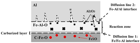 The mass transfer diagram of the Al bar initial melting process is shown in Figure 8. The reaction zone is limited by the two dotted lines, where diffusion line 1 represents the interface between Fe and Fe-Al and diffusion line 2 that between Fe-Al and Al.