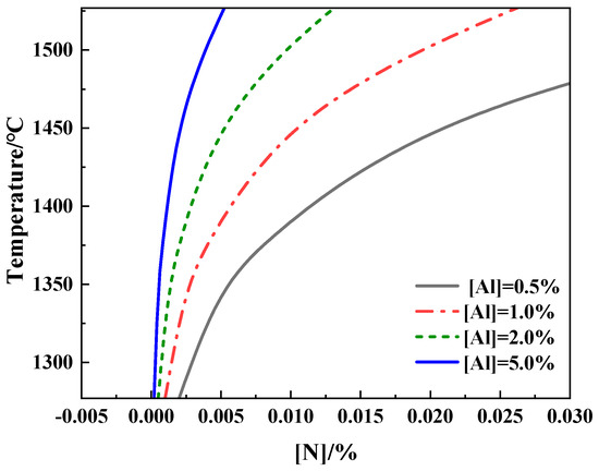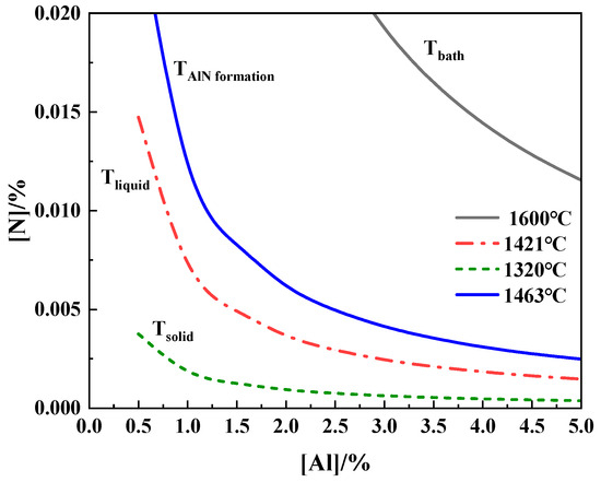 where GAlN is the standard Gibbs free energy of an AlN inclusion, T is the bath temperature (at 1600 °C), KAlN is the equilibrium constant of AlN, and fAl and fN are the activity coefficients of Al and N, respectively. The stability of AlN inclusion formation can be calculated with the above equations. Table 2 shows the calculation process of the activity coefficients. The equilibrium curves of AlN inclusion formation under different [Al] conditions are shown in Figure 10.