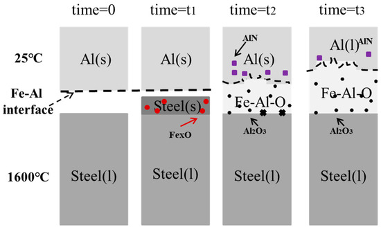 - Different kinds of inclusions of various sizes could also be seen in the Al–Fe interaction area. Some FexO inclusions were generated in the solidified steel layer at the initial contact time. Afterwards, due to local turbulence, molten steel, which contained dissolved O and N, came into contact with the Al bar; hence, small-sized Al2O3-type and AlN-type inclusions were generated in the Al-rich zone. Some large-sized Al2O3 inclusions formed at the interface between Fe and Fe-Al because newly melted [Al] reacted with the previously formed (FexO) inclusions. Finally, the unstable AlN inclusions disappeared because the [Al] and [N] contents did not meet the equilibrium condition with the constant increase in the inner temperature of the Al bar.