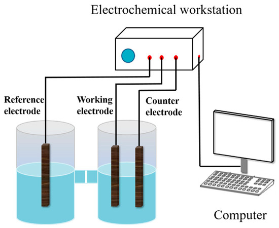 An H-type three-compartment electrolytic cell was equipped with the pyrite carbon paste electrode as the working electrode, a platinum foil as the counter electrode, and a saturated calomel reference electrode (SCE) with a Luggin capillary salt bridge to minimize the voltage drop across the working and counter electrodes. Unless otherwise stated, all potentials in this work were referenced to the SCE (0.245 V vs. SHE at 25 °C). A simplified schematic diagram of the electrochemical setup used in the experiment is shown in Figure 1. All electrochemical measurements were performed at room temperature with a CHI660 Electrochemical Workstation (CH Instruments, Chenhua Co., Shanghai, China) coupled to a personal computer. The effect of various concentrations of SO42− on the electrochemical oxidation rate of pyrite surfaces was investigated by adding different masses of Na2SO4 to the control group electrolyte. In addition, the pH of all electrolytes was adjusted to 2 by using HCl, and the process was carried out at 30 °C.