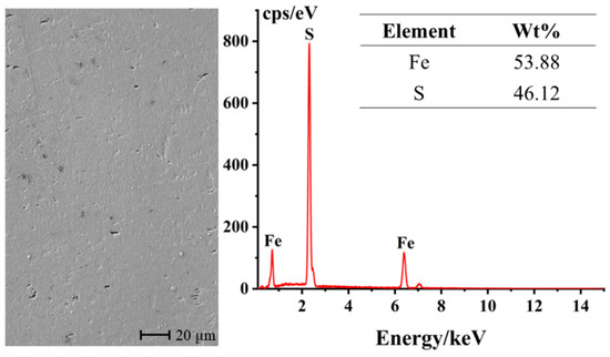 The surface characterization of the unreacted pyrite bulk electrode was conducted using an SEM-EDS. As can be seen from Figure 2, after polishing and grinding, the surface of the pyrite bulk electrode is generally smooth and flat. The few black spots distributed on the electrode surface may be attributed to the presence of minor impurities or lattice defects on the surface. Furthermore, the elemental content analysis reveals that the electrode contains 53.88% sulfur (S) and 46.12% iron (Fe), with an atomic ratio of approximately 2:1, which is very close to the ideal composition of pyrite. This result indicates that the bulk pyrite used in the experiment is of high purity and can meet the requirements of an ideal material for research electrodes.