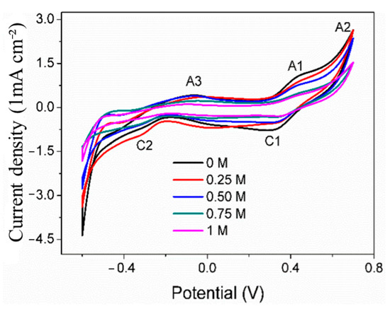 Cyclic voltammetry is usually used to explore the surface oxidation mechanism of the working electrode. Figure 4 shows the CV curves of the pyrite electrode in the electrolyte with the SO42− concentration of 0–1 mol/L. There are three obvious anode peaks on the curves, which are denoted as A1, A2, and A3 (at about 0.50 V, 0.70 V, and −0.1 V, respectively). On the return scan of the pyrite electrode, two cathode peaks were observed at 0.40 V and −0.35 V (denoted as C1 and C2). The above results are in agreement with previous studies [24,25].