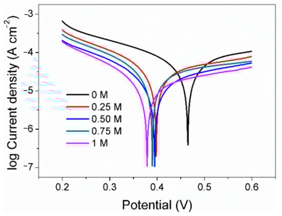 As a classical electrochemical method, Tafel polarization is usually used to explore the corrosion rate of electrodes in a certain environment. It is evident from the observations that the pyrite electrode exhibited consistent polarization profiles across all tested conditions, indicative of a uniform electrochemical interaction mechanism occurring despite varying concentrations of SO42− (Figure 5). According to Tafel polarization theory, the corrosion potential (Ecorr), corrosion current density (jcorr), and Tafel slopes of the anode (Βa) and cathode (βc) were calculated (Table 1).