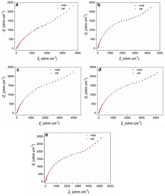 Experimental and simulated Nyquist plots of pyrite electrode in electrolytes with different concentrations of SO42−: (a) 0 M; (b) 0.25 M; (c) 0.50 M; (d) 0.75 M; (e) 1 M.