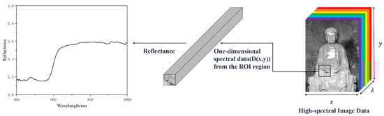 In recent years, some new technologies have been applied in the field of cultural relic composition analysis. Among these, hyperspectral imaging, as a revolutionary non-destructive detection technology, has demonstrated immense potential in artifact preservation and research. Hyperspectral imaging originated from remote sensing technology in the 1980s and has been widely applied in fields such as mineral exploration, geological analysis, food engineering, and agriculture due to its non-contact, non-destructive, and rapid capability for large-scale detection [10,11]. This technology captures optical information from continuous and narrow spectral bands reflected or emitted by the surface of objects, enabling precise measurements across a wide range of wavelengths from visible light to infrared and ultraviolet. By analyzing the generated “hypercube” dataset (Figure 1) that contains rich spectral and spatial information, it is possible to analyze the composition of materials within the region of interest (ROI) and uncover hidden information.