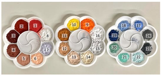 - Additional pigments commonly used in painting exhibit other colors, such as rock gold tea color (4), coral pink (6), purple cloud color (7), agate color (13), and coral color (14).