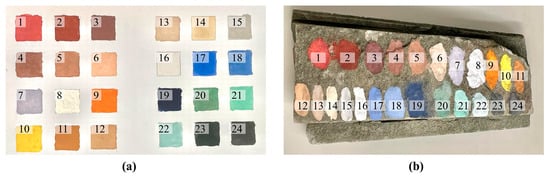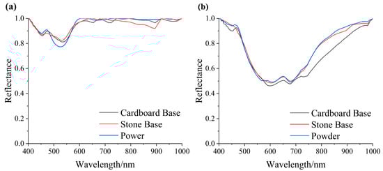 Cave paintings are typically created directly on stone surfaces. In the laboratory, the methods for establishing a mineral pigment database typically include collecting the original spectra of powdered pigments or the spectra of a homogeneous mixture of powdered pigments and a binder applied to the surface of cardboard. To investigate the effect of different substrate materials on the pigment spectra, cardboard and stone substrates from the demonstration site were selected as the two experimental groups (Figure 3b).