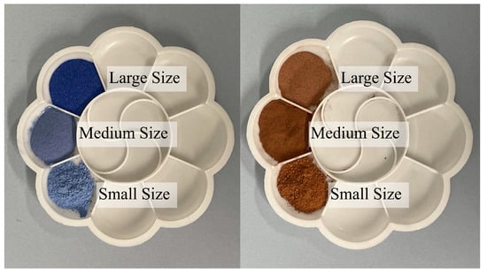 In order to enrich the color gradations of the paintings, painters use grinding techniques to classify mineral pigments into different particle size grades. The pigments of different particle size grades exhibit different hues, thereby enhancing the color expression and artistic value of the paintings. Taking lazurite and ochre red as an example, three particle sizes were selected for comparison: large (100 ), medium (50 ), and small (30 ) (Figure 9).