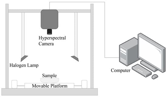 During data collection, the hyperspectral camera needs to be preheated to ensure stable performance. This was followed by adjusting parameter settings, precise focusing, and calibration using a standard whiteboard to improve the accuracy and reliability of image acquisition. Finally, the sample to be tested was placed on a movable platform for imaging. After data collection is complete, the hyperspectral images can be viewed and saved using a host computer.