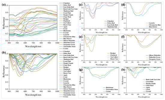 (a) Original spectral curve of pigment powder; (b) spectral curve of pigment powder after removing the envelope; (c) red spectrum; (d) blue spectrum; (e) yellow spectrum; (f) green spectrum; (g) black spectrum; (h) white and other series spectrum.