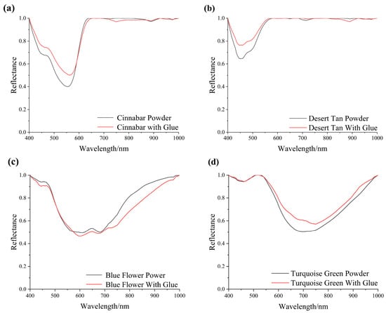 Representative colors from four common hues (red, yellow, blue, and green) were selected (Figure 7). As shown in Figure 7a, there is a significant difference in emissivity between powdered cinnabar and cinnabar mixed with glue within the range of 400 to 580 nm. At 750 nm, cinnabar with glue forms a small absorption peak. For desert tan (Figure 7b), there is a difference in reflectance between 400 and 550 nm. At 700 nm, desert tan powder shows a small absorption peak, whereas the spectrum with glue does not. Conversely, the spectrum with added glue exhibits a new absorption peak at 900 nm. The spectra remain overlapping at other wavelengths. The spectral curves of blue flower overlap from 400 to 700 nm (Figure 7c), with small differences noted beyond 700 nm. The spectral curve of turquoise green completely overlaps between 400 and 550 nm, with slight differences thereafter (Figure 7d).