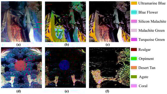 Spectrum identification results: (a) Dazu Rock Carvings; (b) overall recognition result; (c) results of sleeve pigment recognition; (d) Qiqu Mountain Grottoes; (e) overall recognition result; (f) local detail of the dragon on the right.