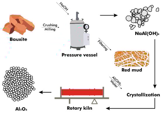 In the Bayer process, bauxite ore undergoes processing to produce purified alumina, necessitated by the impurities within the ore (Figure 3). High-porosity and reactive activated alumina are produced in situ from the bauxite rocks with minimal processing, without direct purification from the ore [23]. This process involves adding ground and blended bauxite and sodium hydroxide (NaOH) to a pressure vessel at temperatures ranging from 150 to 265 °C, depending on the concentration of aluminum compounds present [24]. The compounds dissolve, creating an equilibrium as described by Equations (1) and (2) [25], with conditions favoring the reaction’s shift to the right to produce hydrated NaAl(OH)4 in a step known as digestion.