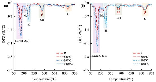 Differential thermogravimetry (DTG) of pastes at curing times of (a) 3 days and (b) 28 days. E, ettringite (Ca6Al2S3H64O60); C-S-H, calcium silicate hydrate; Ms, monosulphate (Ca6Al2SH24O22); Ht, hydrotalcite (Mg6Al2CH24O52); CH, portlandite (CaO2H2) [85].
