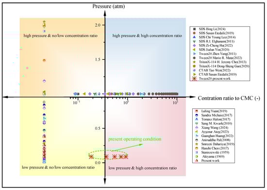 Table 1 summarizes the comparisons of various studies under different conditions, listing the experimental conditions at different sub-atmospheric pressures and surfactant concentrations. selection of the four most common surfactants: SDS (CMC = 2300 ppm), Tween 20 (CMC = 600 ppm), TritonX-114 (CMC = 120 ppm), CTAB (CMC = 1500 ppm), all of the CMC were measured at room temperature. As shown in Figure 1, after organizing the existing literature using the four-quadrant method, the solid points and semi-solid points, respectively, represent the results of changes in surfactant solution concentration and pressure. It can be observed that the literature lacks research on surfactant concentration under low-pressure conditions. As a matter of fact, under saturated conditions, pressure variations can alter the boiling temperature, subsequently affecting solute solubility and CMC [36]. Additionally, the coupled effects of pressure and surfactants can lead to changes in bubble growth and detachment parameters, such as the gas–liquid density ratio, surface tension, latent heat of vaporization, and the hydrophilic–hydrophobic balance of surfactant molecules. The intensity of bubble disturbances is directly related to heat transfer efficiency.