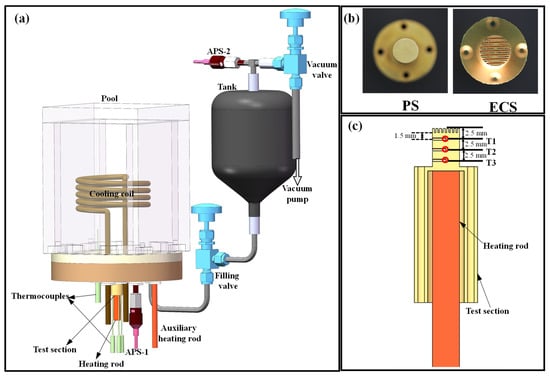 As shown in Figure 2a, the boiling pool is constructed from acrylic material in a square space. It includes a condensation coil to maintain stable pressure, a copper block surface for testing heat transfer effectiveness, a hollow cylindrical base for inserting heating rods, an auxiliary heater for maintaining temperature stability, and APS and armored T-type thermocouples for real-time monitoring of pressure and temperature.