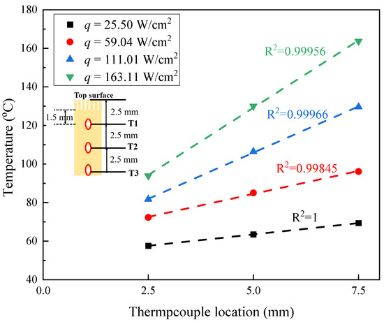 According to Fourier’s law, the heat flux q is calculated using Equation (1), where is the thermal conductivity of copper. represents the slopes of the lines obtained by linear fitting of the temperature points from the three measuring points.