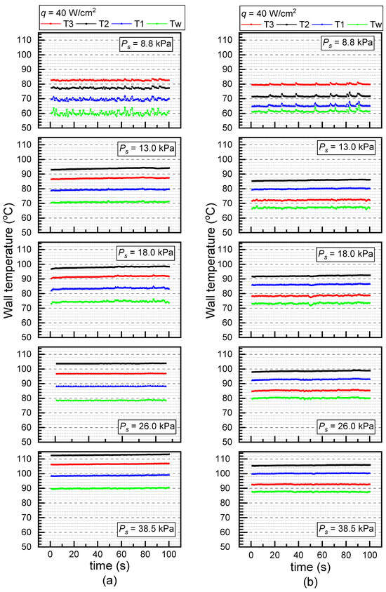 Temperature oscillations at different saturated pressures under q = 40 W/cm2 and c = 0 mL/L (a) PS and (b) ECS.