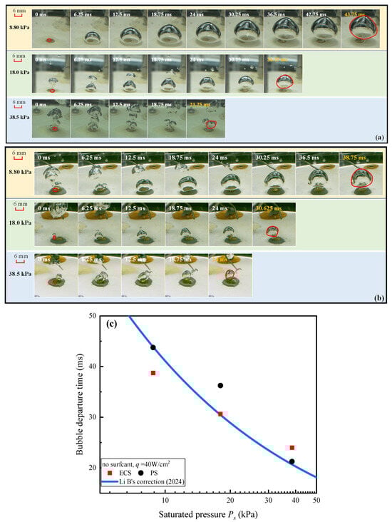 Visual results of bubble growth and detachment on (a) PS and (b) ECS under q = 40 W/cm2 and c = 0 mL/L, and (c) variations of bubble detachment time versus with saturated pressures.