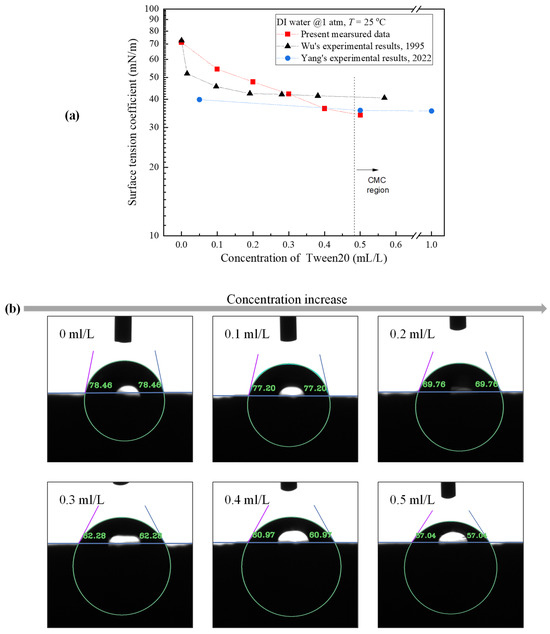 Figure 6 displays the variations of (a) the surface tension coefficient and (b) the static contact angle versus the surfactant concentration. The surface tension coefficient was measured by the Wilhelmy plate method at atmospheric pressure. Compared to other researchers [31], the surface tension coefficient generally decreases with increasing concentration. By analyzing the curves of the adjacent data points, it is found that the trend of decreasing surface tension coefficient with increasing concentration becomes gradually smoother, fitted with the reported critical micelle concentration (CMC) of Tween 20 that ranges from 0.48 to 0.6 mL/L [56]. Moreover, the measured static contact angle by using a static contact angle measuring instrument (DSA-X ROLL, Guangzhou, China) varied from 78.46° at c = 0 mL/L to 57.04° at c = 0.5 mL/L, reflecting the improvement in the hydrophilicity.
