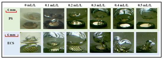 Figure 7 compares the detach diameters of the bubble on the two surfaces. Despite limitations imposed by the camera’s range of observation, a trend can still be observed: as the concentration increased, the surface tension coefficient decreased, and bubbles were prone to detach, leading to a reduced bubble detachment diameter. The decline trend was even more pronounced on the ECS, especially when comparing the case of c = 0 mL/L to c = 0.5 mL/L.