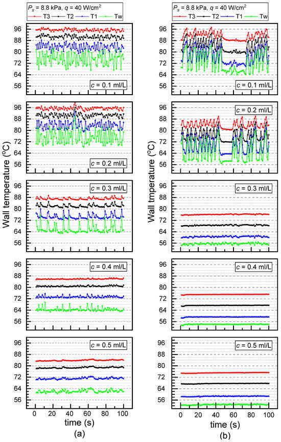 Temperature oscillations at different concentrations under Ps = 8.8 kPa and q = 40 W/cm2 (a) PS and (b) ECS.
