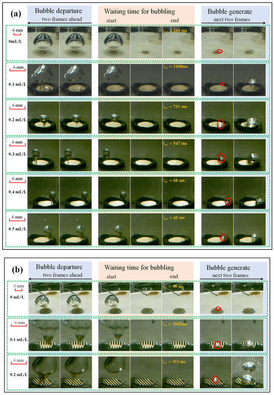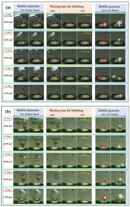 Figure 11 presents the visualization results of under Ps = 8.8 kPa and c = 0.1 mL/L. As shown in Figure 11a, the on the PS declined from 1710 ms to 23 ms as the heat flux increased from 30 W/cm2 to 70 W/cm2. The sharp drop in the waiting time corresponds closely with the elimination of temperature oscillation in Figure 10a. Increased heat flux, increased wall superheat, and decreased bubble waiting time are consistent with the negative correlation between waiting time and wall superheat presented by Basu et al. [57]. It should be noted that the waiting time on the ECS at the same heat flux of 30 W/cm2 was about 3.4 times longer than that on the PS, as shown in Figure 11b, which is consistent with the aggravated temperature oscillation exhibited in Figure 10b. This aligns with the view that the presence of microchannels leads to enhanced disturbance. Moreover, the waiting time on the ECS was 609 ms at 50 W/cm2 and 1331 ms at 60 W/cm2, which is accordant with the amplitude enlargement in temperature oscillation under these two cases.