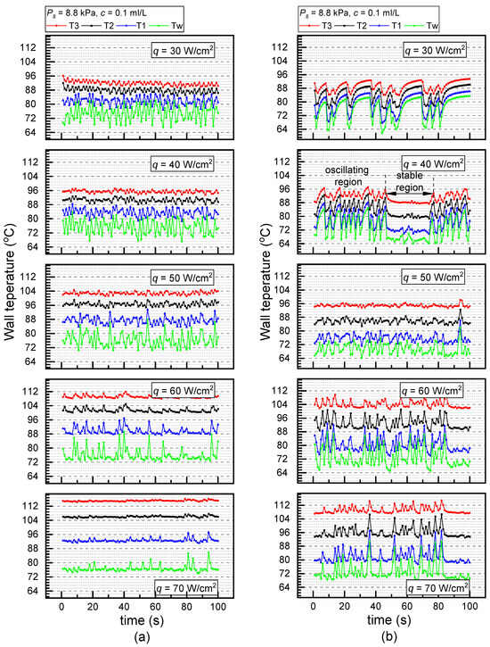 Heat flux provides extra energy for the nucleation and growth of bubbles. The increase in superheat leads to a higher nucleation rate of bubbles. Figure 10 compares the temperature oscillations along with the heat flux on the PS (a) and the ECS (b) under Ps = 8.8 kPa and c = 0.1 mL/L. As illustrated in Figure 10, for both the PS and ECS, the temperature oscillation becomes weakened with the increase in heat flux, illustrating that the intermittent bubbling phenomenon is more pronounced under low heat flux conditions. It is found that the influence of heat flux on temperature oscillation on the PS is more significant than the ECS. For instance, the oscillation amplitude of Tw was about 10 K at q = 30 W/cm2 and 2 K at q = 70 W/cm2 on the PS, whereas the oscillation amplitude of Tw was about 14 K at q = 30 W/cm2 and10 K at q = 70 W/cm2 on the ECS. This may be because the liquid velocity and forced convection yielded on the channel surface are stronger than on the plane surface. Thus, the temperature oscillation on the ECS is less sensitive to the increase in the heat flux.
