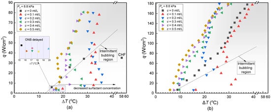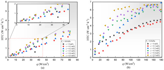 Figure 12a plots the boiling curves of DI water with various surfactant concentrations on the PS under PS = 8.8 kPa, where the black square points refer to the condition without surfactant. It was found that the boiling curve of DI water with surfactant presented as an “S” shape. The superheat ΔT increased first and then decreased gradually. The results under sub-atmospheric pressure were different from the atmospheric conditions, as described in [24,31,58]. Compared to the case without surfactant, the heat transfer enhancement brought about by the addition of surfactant only occurred in high heat flux or high concentration regions (>0.3 mL/L). Under low heat flux conditions, severe temperature overshoot occurred when the surfactant concentration varied from 0.1 mL/L to 0.3 mL/L. For instance, at q = 10 W/cm2, the temperature overshoot at c = 0.1 mL/L was about 32.5 °C, which was 17 °C higher than that at c = 0 mL/L. This corresponds to the intermittent bubbling behaviors on the heating surface. The temperature overshoot became relieved when the surface concentration increased to 0.4 mL/L. Moreover, at c = 0.1 mL/L, the boiling heat transfer improvement did not occur until q was larger than 50 W/cm2, whereas the boiling enhancement worked only when q was larger than 20 W/cm2 at c = 0.5 mL/L. In addition, considering the dual role of surfactants in reducing static contact angle and surface tension coefficient, the onset of nucleate boiling (ONB) was delayed compared to the case without surfactants, but the order of delay was not exactly consistent with the order of concentration reduction. Moreover, CHF appeared at about 40 W/cm2 on the PS when no surfactant was added, but no CHF was recorded after adding Tween 20, indicating the positive role of surfactant in raising the boiling CHF under low saturated pressures. As shown in Figure 13a, the continuous increase in heat flux leads to the maximum HTC reaching 2.86 W·cm−2·K−1 when PS = 8.8 kPa, c = 0.4 mL/L, and q = 80 W/cm2, compared to the case where c = 0 mL/L. This represents a 138% increment.