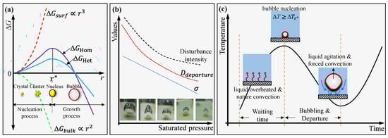 According to classic nucleation theory [59], as shown in Figure 14a, the resistance to the formation of critical nuclei in superheated liquid (surface free energy ) is compensated by 2/3 of the decrease in the volume free energy , while the remaining 1/3 of the resistance is compensated by the energy fluctuation in the superheated liquid. As long as the structural fluctuation of the superheated liquid is , and the energy fluctuation is , the interface between the crystal nucleus and the liquid phase can be formed, and the stable crystal nucleus continues to grow and form a bubble. For heterogeneous nucleation, the required activation energy of nucleation is closely related to the characteristics of the nucleation surface [59], i.e.,